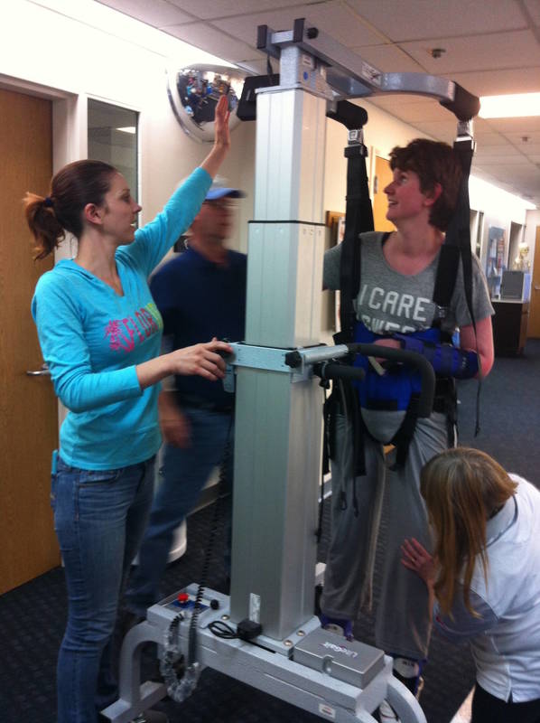 Yet progress comes slowly, and minute movements become major victories for this weary yet resourceful family. This year, with their insurance company’s lifetime benefit allowance exhausted, Terri and Grant devised their own version of a treadmill with a walking harness and lift system so Allison could continue her therapy at home.